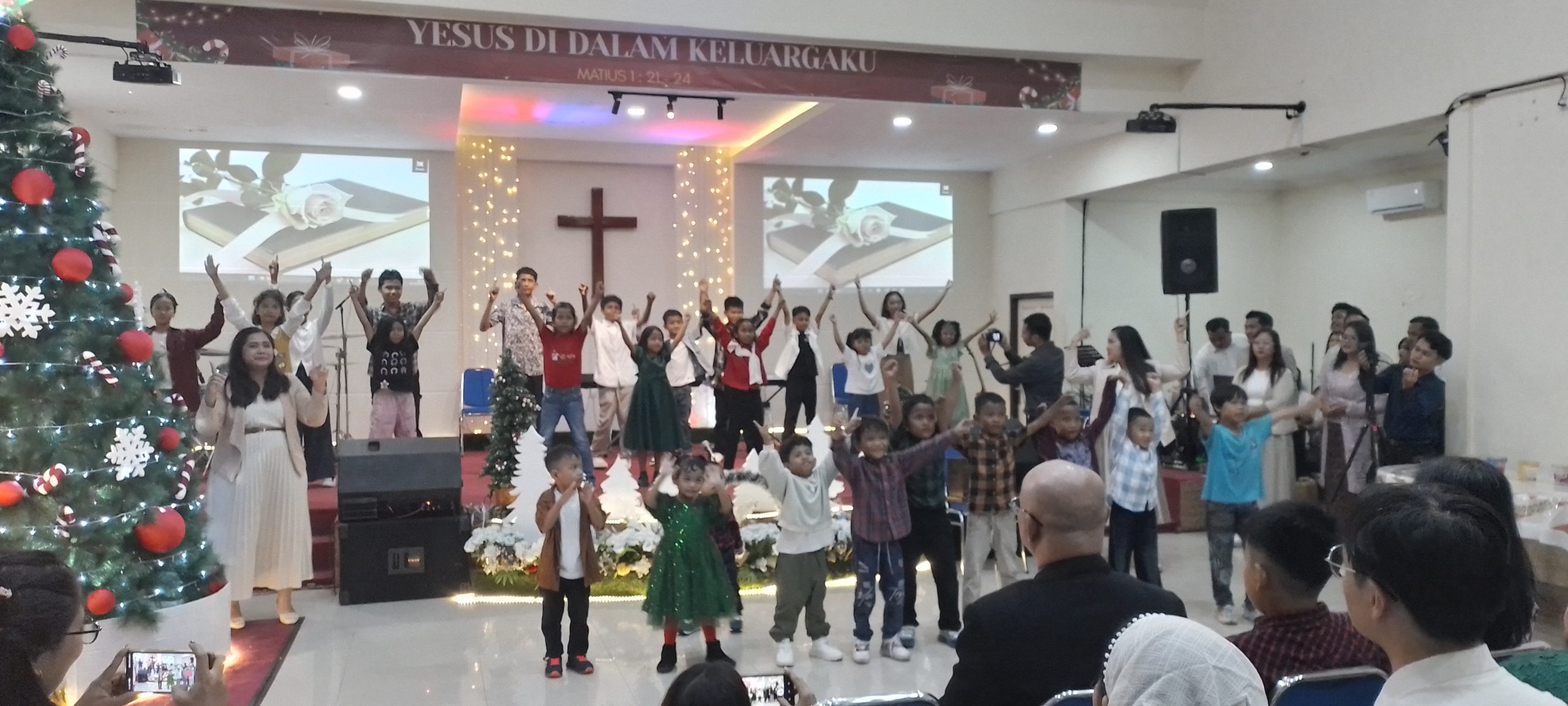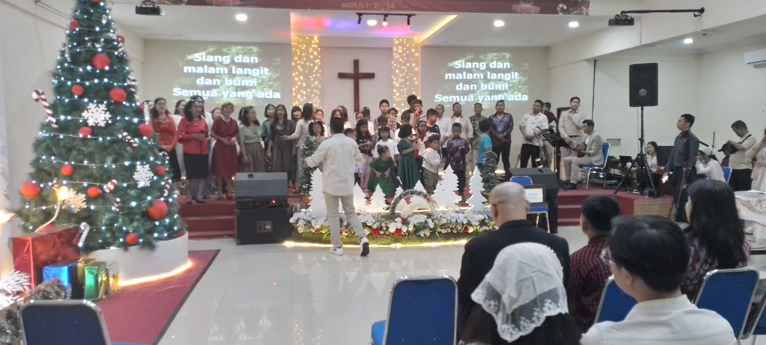 Ibadah diawali dengan kidung-kidung pujian yang menyambut kelahiran Sang Juruselamat, yang dibawakan oleh anak-anak Sekolah Minggu dan para pemuda gereja. Suasana semakin menyentuh saat seluruh jemaat bersama-sama menyanyikan lagu “Malam Kudus”, diiringi dengan penyalaan lilin sebagai simbol terang dunia yang telah lahir, yaitu Tuhan Yesus Kristus.