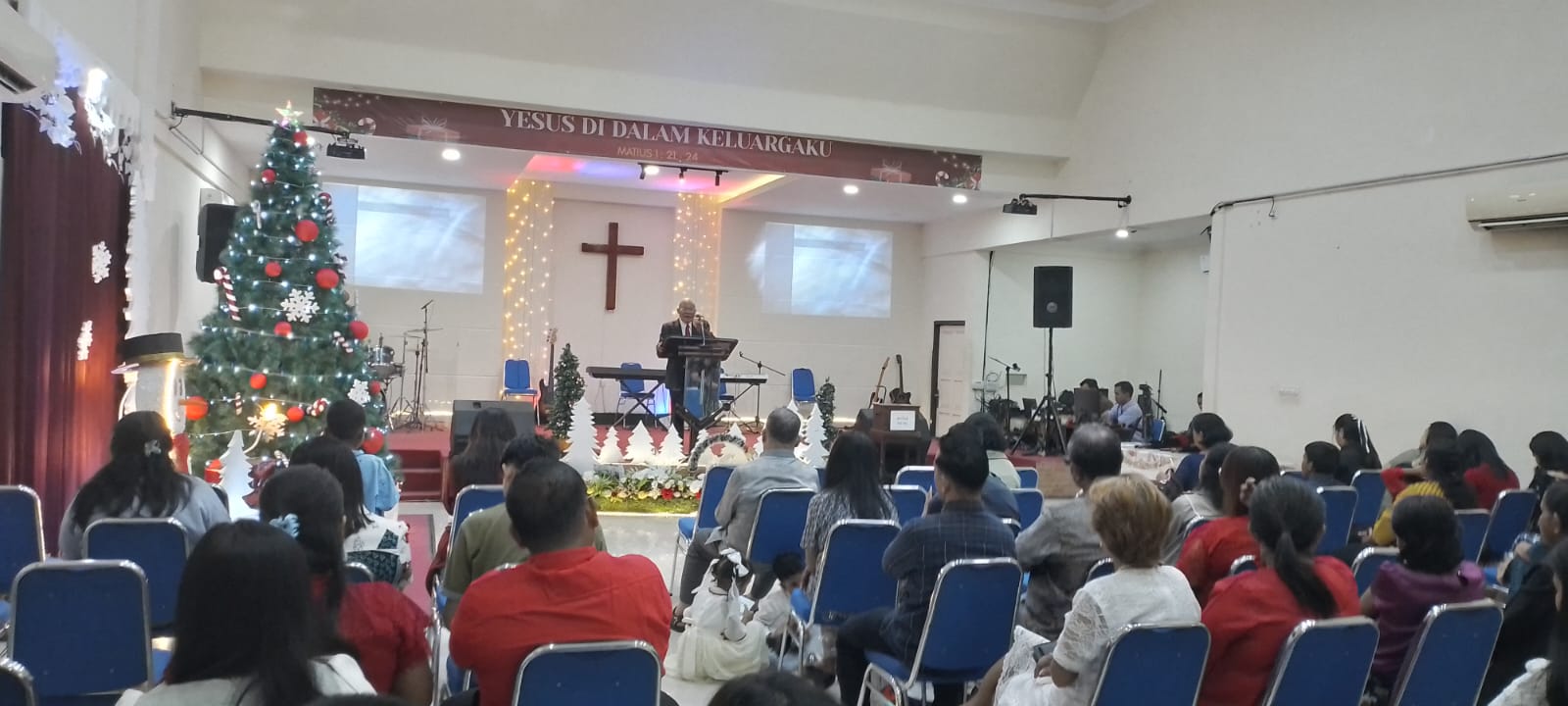 Sekitar 200 jemaat hadir memenuhi gedung gereja dan mengikuti ibadah dengan penuh penghayatan. Suasana ibadah semakin khidmat saat jemaat melantunkan pujian rohani, di antaranya lagu “Gita Surga Bergema.”