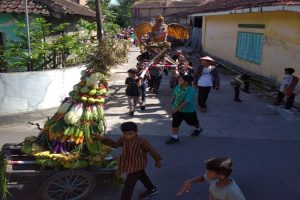 Selesai pembagian hadiah lalu sayur mayur dalam gunungan diambil oleh para orang tua murid yang ikut, di bagi bagi dengan di masukkan ke dalam tas plastik. Selanjutnya saya dan para murid semuanya membagikan sayuran itu ke warga sekitar Joglo Paseban. Saya mencari orang yang belum dapat sayuran dan saya melihat orang di pojok kanan itu belum dapat lalu saya berikan, “Ini ya bude hasil gunung-an saya; semoga bermanfaat ya.”