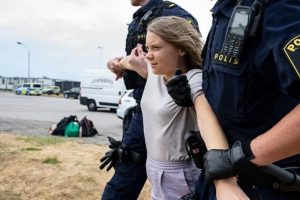 Thunberg ditangkap polisi, 19 Juni 2023, karena menolak akan lokasi unjuk rasa di sebuah pelabuhan di Malmö, Swedia.