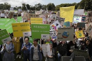 Di sampingnya tampak poster berisi kritik dan dorongan bagi otoritas untuk mengambil tindakan terkait perubahan iklim.