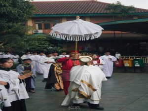 Romo Wartaya SJ, yang memimpin misa tutup Tahun Yubilem ini, Sementara perarakan berlangsung dilagukan nyanyian perarakan.