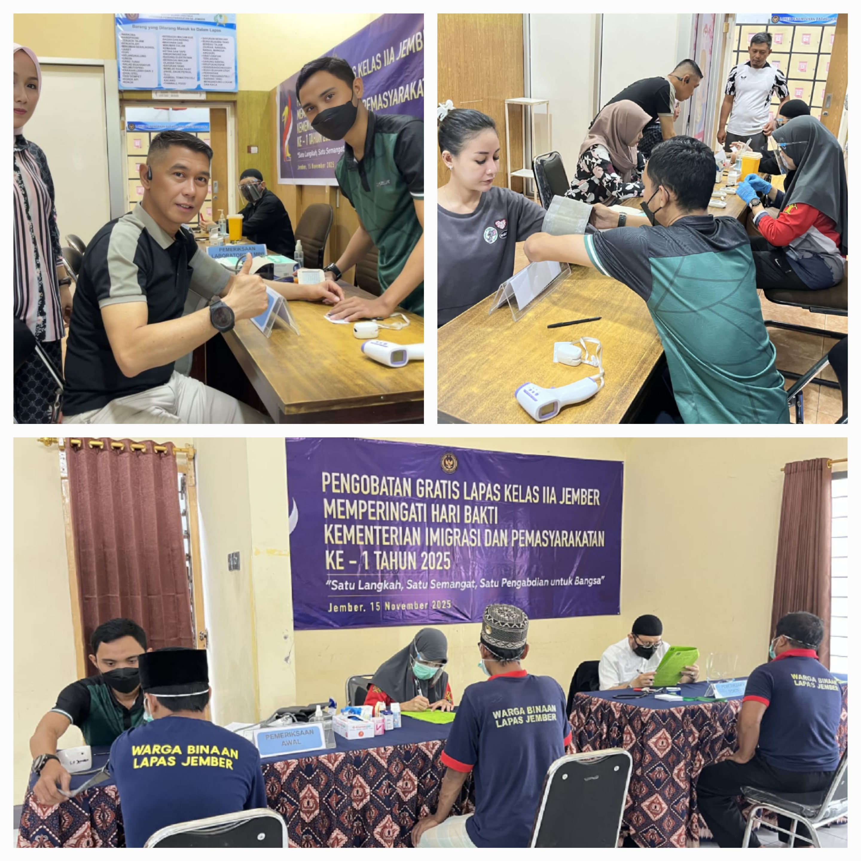 Jember,Liputannusantara.id-Dalam rangka memperingati Hari Bhakti Kementerian Imigrasi dan Pemasyarakatan (Kemenimipas) RI ke-1 Tahun 2025, Lembaga Pemasyarakatan (Lapas) Kelas IIA Jember menggelar kegiatan pemeriksaan dan pengobatan gratis bagi pegawai, masyarakat umum, serta Warga Binaan Pemasyarakatan (WBP), pada Sabtu (15/11/2025).